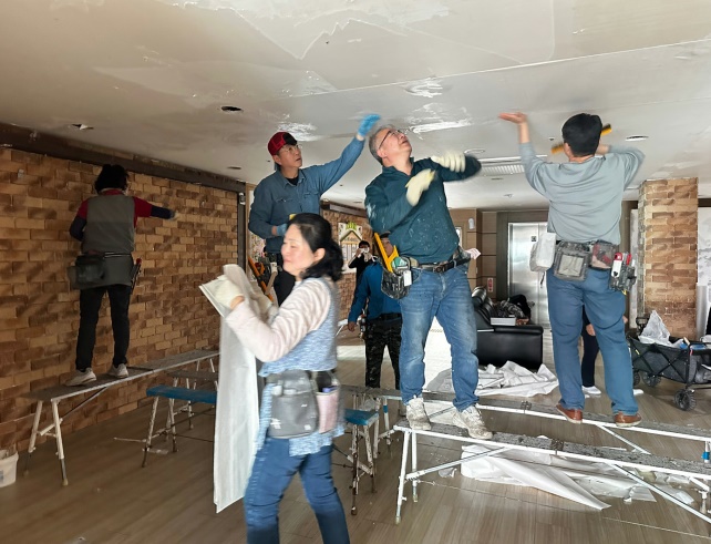 <도배와 천장 공사를 진행하는 포시즌봉사단 회원들>