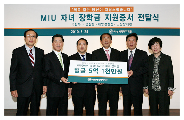 재단은 지난 24일(월) 송파구 풍납동 아산교육연구관에서 군ㆍ경ㆍ해경ㆍ소방 관계자가 참석한 가운데 천안함 사건을 계기로 열악한 근무환경에서 자기희생을 마다하지 않고 헌신하는 군인, 경찰, 해양경찰, 소방 공무원들의 어려움을 덜어주기 위해 이들 자녀들에게 'MIU 장학금'을 지원하기 위한 협약식을 가졌습니다. 대학생 자녀 1인당 연 300만원씩, 매년 170여명에게 총 5억1,000만원의 장학금을 올해 하반기부터 지원할 예정입니다. 군인의 경우 육군ㆍ해군ㆍ공군ㆍ해병 준사관급, 경찰과 해양경찰은 경위 이하, 소방관은 소방위 이하 직급의 자녀에게 장학금이 지급됩니다. 재단의 ‘MIU 장학금’은 일선에서 국가와 시민의 안전을 위해 가장 헌신적으로 근무를 하고 있는 ‘제복을 입은 대원들(Men in Uniform)’의 공로를 치하하기 위해 제정되었습니다.