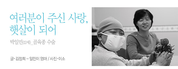 수술에서 깨어난 일민이가 “엄마, 내 다리는?” 하고 물었습니다. 그 순간 저는 “네 다리 없어졌어…”라고 말해야 하는 못난 엄마였습니다. 곧 상황을 알아차린 일민이는 자신은 괜찮다면서 오히려 울먹이는 저를 위로했습니다. 그리고 뼈에는 약한 항암제가 듣지 않아 독한 약을 써야하기에 수술보다 더 고통스럽다는 항암치료를 받아야 했는데, 그 치료조차도 너무나 잘 견뎌내고 있습니다. 이렇게 의젓하고 밝은 일민이, 앞으로 작은 것이라도 나누는 사람이 되어 세상을 환하고 밝게 하면 좋겠습니다.
