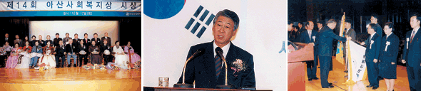 아산재단은 지난 12월 17일 서울아산병원 대강당에서 제14회 아산사회복지상 시상식을 개최했다. 이 자리에는 재단의 김진현 상임이사, 성공회대 김성수 총장 등을 비롯한 내외 귀빈과 수상자 가족 등 500여 명이 참석했다.이날 사회봉사상은 불우아동과 장애인들을 위해 헌신해 온 은평천사원 조규환 이사장과 스페인 출신으로 성심원에서 한센병 환자들을 보살펴 온 유의배 신부가 각각 수상했다. 재단은 이번 봉사, 효행 부문의 23명 수상자에게 1억 6,000만 원의 상금을 지급했다.