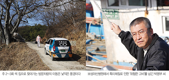 봄볕 따사로운 들녘과 마주한 율어면 문양리의 한 농가. 폐쇄성폐질환을 앓는 허노순 할머니(90)는 새액쌕, 밭은 숨소리를 내면서도 반가운 얼굴로 간호사를 맞이하신다. “할머니가 약을 잘 안 드셔서 오늘은 기침 안정시키는 주사 처방이 나왔어요. 어지럽고 힘드시더라도 약은 꼭 드셔야 해요. 안 그러면 다시 입원해야 할지도 몰라요.” 곽선희 간호사(37)의 협박 어린 당부에 할머니는 “시키는 대로 할께. 속이 자꾸 야분대서(쓰려서) 안 먹었지.”라며 어린아이처럼 응석을 부리신다.